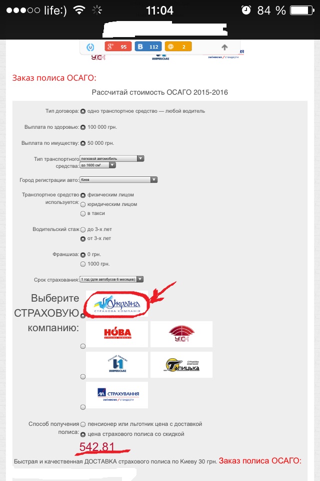 (скриншот страницы сайта, на котором до сих пор можно просчитать и приобрести полис обанкротившейся компании «Украина» сделан 24.04.2015)